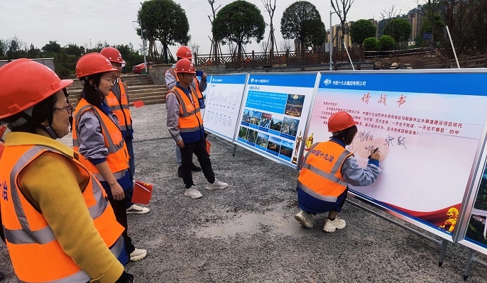 在办实事、开新局环节,项目部组织政府、业主、监理、设计等代表和媒体记者,实地参观了巴中山水廊道项目施工现场,展示项目建设的亮点和成果,详细介绍了项目区位、施工理念、管理模式、安全质量管理等情况,进一步展示了公司的标准化管理和良好品牌形象。在中心广场,项目全体员工在“请战书”上签字,为坚决完成目标任务立下铮铮誓言。