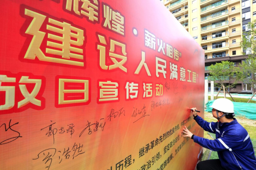 在办实事、开新局环节,项目全体党员在党旗下重温入党誓词,表示要践行长征精神,建设人民满意工程,更加坚定作为一名共产党员的理想信念;活动中,6766澳门娱乐直营党群工作部向党员突击队和青年突击队授旗,各方代表表达了“践行初心使命,认真履职尽责”的决心;全体职工签下请战书,纷纷表示将继续充分发扬“一天也不耽误,一天也不懈怠”的6766澳门娱乐直营精神,以求真务实、开拓创新的精神,把全部力量凝聚到项目建设中来,向成都市人民交出一份满意的答卷,随后,各方代表围绕安全环保、项目建设、工程质量、工程进度等情况进行充分探讨,对6766澳门娱乐直营董家埂社区工程的建设亮点进行深入了解。
