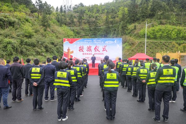 在办实事环节,全体人员来到三施高速德明收费站外广场,开展了“践行遵义会议精神,建设人民满意工程”主题授旗仪式。通过为党员突击队和青年突击队授旗,全面展示了项目在发挥党员在项目管理创新、技术攻关、优质服务创建等工作任务中的带头作用、骨干作用和表率作用,深入推进党团共建,强化示范引领,巩固和扩大党在青年团员中的影响力;突击队代表表态,在工作中发扬能打硬仗、善打硬仗的革命精神,弘扬坚定信念、务求必胜的遵义会议精神,全身心投入到公司生产经营重点、难点任务中去,勇于创新,敢为人先,凭实力在企业发展中建功立业,不忘初心,牢记使命,聚焦提升群众幸福感和获得感立足岗位努力工作,办实事,开新局,谋新篇,推动企业高质量发展,为实现中国梦努力奋斗。